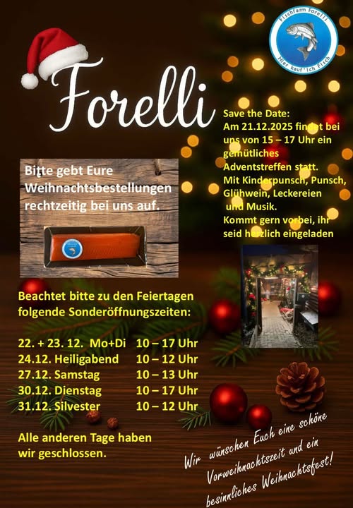 Besuchen Sie uns auf der • Fischfarm Forelli • Ihre Vorbestellungen nehmen wir gern persönlich unter 04349 – 919914 entgegen.